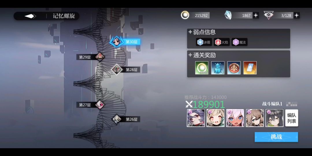 原本想尝试自动通关记忆螺旋30层需要多少战力,结果19w战力还是差一点才能通关,痛苦面具.jpg,我只好手动来打了,没有锁定的智能ai是真的折磨人。