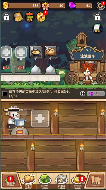 1.大体的游戏流程雇英雄刷材料→厨师做料理赚钱→提升英雄和厨师的等级→刷更稀有的材料做更赚钱的料理。大体上就是刷刷刷,然而不能离线,离线厨师会正常把在做的料理做完,但是英雄不会刷材料,顾客也不会来买东西。2.如何赚钱前期的料理简单,做一个花的时间少,卖的价格低,所以会出现堆了很多料理库存,感觉卖不完。这里注意一下,没有库存的料理就把它下架,因为顾客只会买你在上架的料理,不会造成客源流失。到