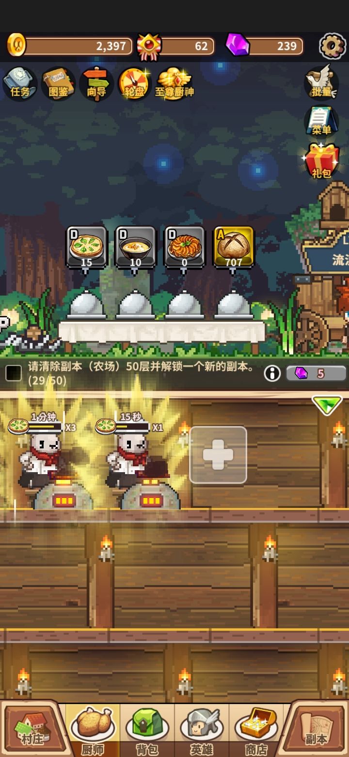 1.大体的游戏流程雇英雄刷材料→厨师做料理赚钱→提升英雄和厨师的等级→刷更稀有的材料做更赚钱的料理。大体上就是刷刷刷,然而不能离线,离线厨师会正常把在做的料理做完,但是英雄不会刷材料,顾客也不会来买东西。2.如何赚钱前期的料理简单,做一个花的时间少,卖的价格低,所以会出现堆了很多料理库存,感觉卖不完。这里注意一下,没有库存的料理就把它下架,因为顾客只会买你在上架的料理,不会造成客源流失。到