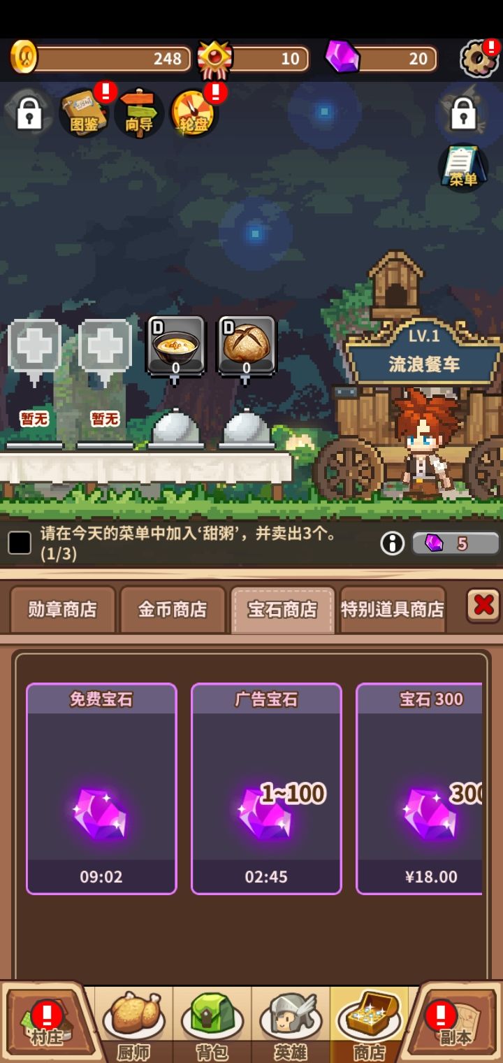 招英雄组队下副本打食材,然后让厨师做饭去卖的故事。打怪是放置类的,烧饭要花点时间