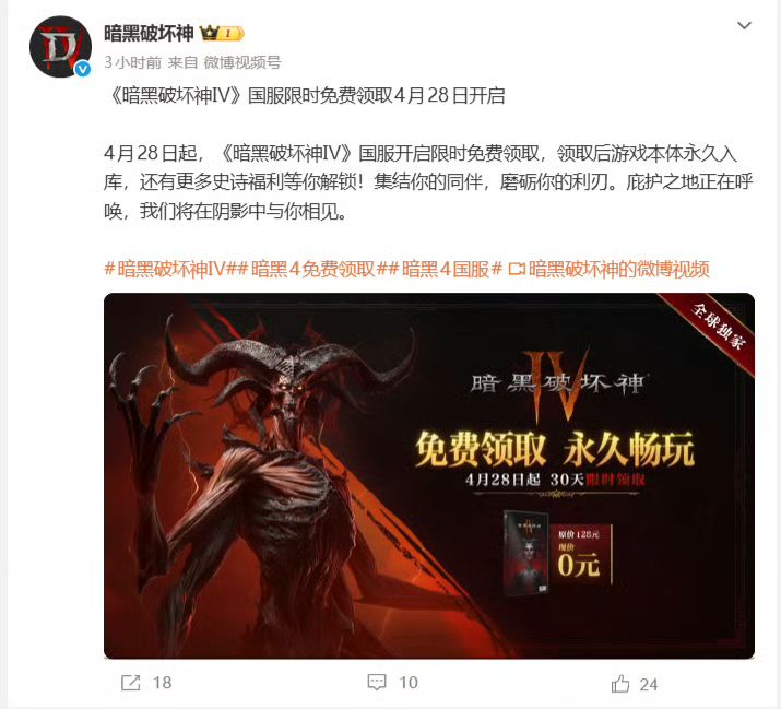 🔥 暗黑4国服本体限时免费送!新老玩家均有重磅福利,4月28日开启领取2400白金币补偿老玩家 国服由网易代理运营的暴雪经典暗黑系列最新作《暗黑破坏神4》 近日传来喜讯,官方宣布为庆祝新DLC憎恨之王上线,原价128元的《暗黑破坏神4》国服基础本体,将于2026年4月28日0时至5月27日23时59分免费赠送给玩家这一项让玩家集体沸腾的重大福利出自网易之手,令全网玩家惊讶,引发玩家热议。#主机单机