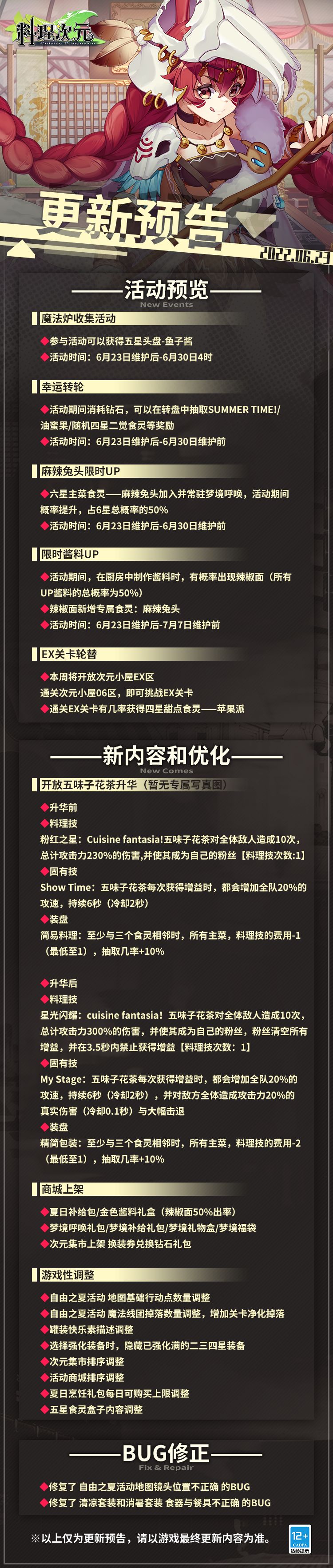 公告 | 法国干红登场&河豚刺身觉醒 听说又来了一位食灵!↑↑↑ 似乎是在万圣节降临的魔女呢 六星汤饮——法国干红微醺登场~ (策划:未成年主厨禁止饮酒! 哦,未成年今天不能上线呢,那没事了) ===== 攻略组重启活动 活动时间 即日起长期有效 参与方式 b站、贴吧投稿视频或文字攻略 (其他任意内容的视频、文字创作皆可) 2021年4月1日及以后的投稿,皆判定为有效 奖励内容 视频投稿:播放量超
