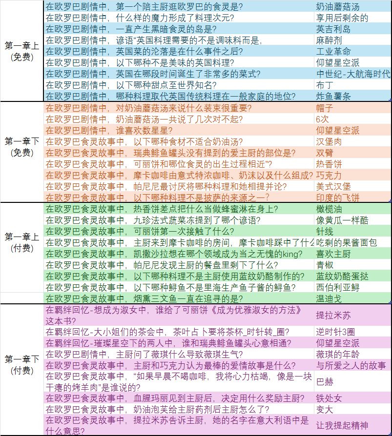更新前后我两个号的顺序有点不一样,还是注意一下吧。 上: 闯入梦境:纳豆白子 谁察觉到危机召唤主厨:次元的魔女 主厨一行人在哪迷路:神社 供奉给神明的供品:纳豆 阴阳道被编入:神道 阴阳道的结界:咒符 谁识破结界:关东煮 阴阳道在江户时期:已经不流行 没有提到的封印:六象封印 ——— 下: 被困在什么结界:四方封印 诱饵:薇琪 纳豆白子被称为:偷腥猫(是猫,别看成喵了) 纳豆白子代表的负面情绪:嫉