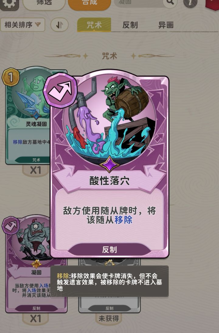 【月圆之夜ccg攻略】死神半干扰卡组卡组(示例),可调整,灵活性高,强度在线,后期新卡池开放,强度还能提升思路:主要以干扰对手卡组为核心,搭配死神的过牌和伤害,做到攻防兼备的效果。其中的反制牌有破坏,凝固,酸性溶液搭配恐惧海盗为干扰核心,带满三张;雾海降临和灭世两张神卡有就必带;咒语突破至少一张,可卡对手经济;陷阱拆解2张最舒服;灵魂之主为死神被动启动器,三张拉满;恐惧低语和死神硬币保证经济和