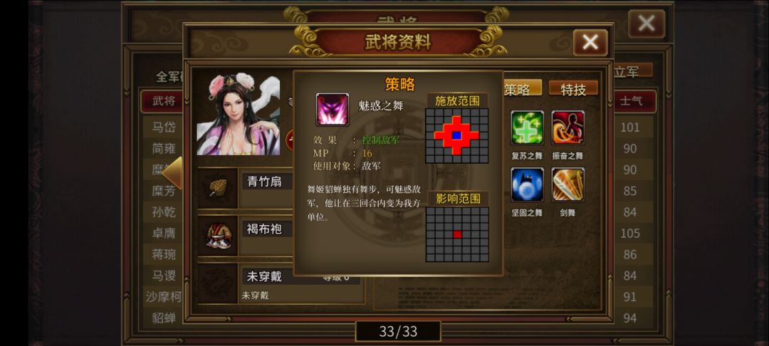 在有限的資源內 特別介紹 貂蟬 在每個玩家所差異的無非是課多少,有多少禮包,成就的資源。 劇情內重要的腳色劉備,關羽,張飛,趙雲等腳色都需要做一定培養來面對一些獨立關卡或者重要腳色不能死亡。 特別介紹貂蟬的原因有幾點 1.為內購武將,幾乎不被劇情因素無法出場 2.為法將,前關卡多無劇情法將可以做為攻擊打手 3.高優質的策略及特性 魅惑之舞(cd三回合):魅惑武將成為友軍三回合 劇情內除了極少數特別