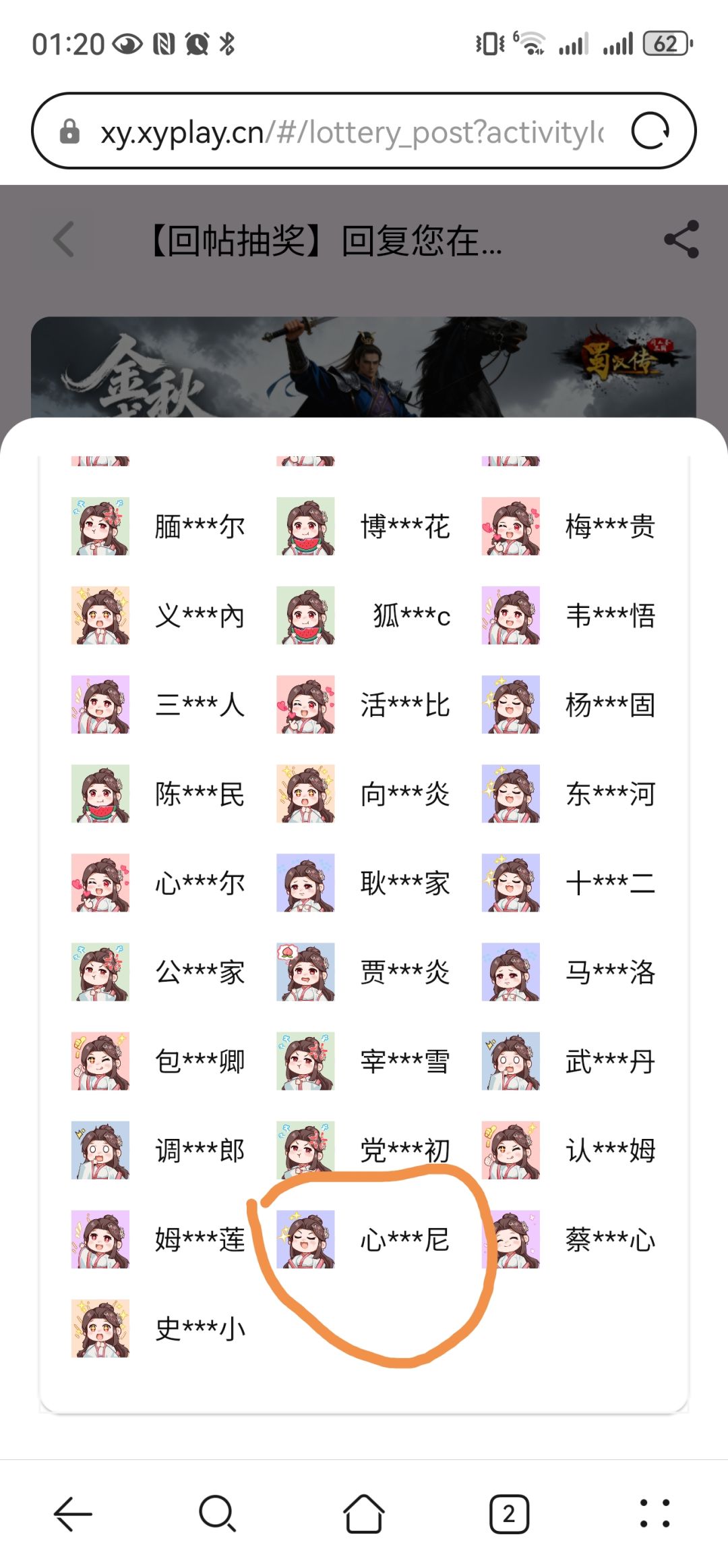 中奖名单公布!!!----------------------------------------------------------------- 恭喜以上主公获奖,奖励将直接发到游戏邮件处,请中奖的主公前往邮件领取奖励,如有疑问可咨询二二!~ 礼包领取时间:5月24日-5月31日 礼包领取方式:领取时间内登陆游戏即可于邮件处领取奖励。