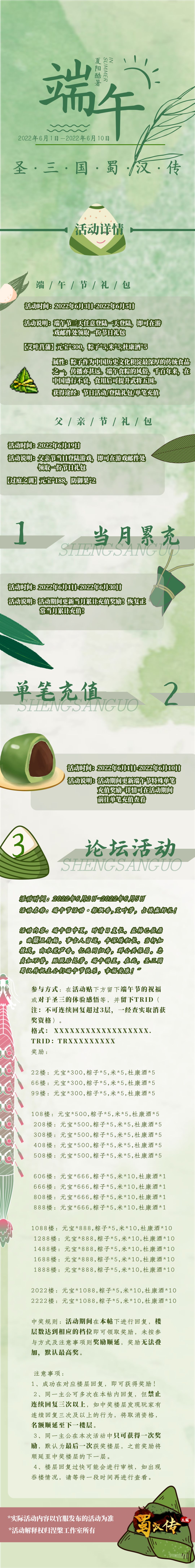 亲爱的主公们: 光辉灿烂,日月如梭! 转眼已近端午, 在此, 同人圣三国蜀汉传愿主公们生活里粽有幸福和甜蜜,粽有情意和顺利。 艾蒿一束,飘幸福清香,绕着你; 香粽一串,携甜蜜相伴,围着你; 香囊一个,表情意万千,粘着你。 >>>本次活动有: # 节日登录礼包 # 端午节、父亲节登录双重福利! # 超值单笔奖励 # 各档位奖励赠送粽子! # 当月累计超值 # 当月累计上新,等你来领! # 火热论坛活