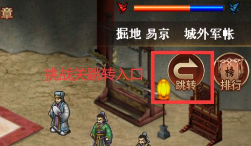 特定关卡右上键的跳转按钮就是新版本的挑战关入口(图一)。 点击跳转后会进入"挑战关 浮生营帐"(图二)。 点击浮生选择进入挑战关或者演武场。点击“返回”退回到进入时的主线关卡。 进入挑战1~挑战19后无法直接返回,需要打完一次挑战关后会自动退回到"挑战关 浮生营帐"。 演武场返回主线方式是: 点击演武场浮生,接着点击“返回选择”,这个时候会弹出挑战关和演武场的选择页面。然后点击“进入演武场”,在“