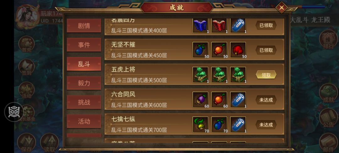 乱斗模式(爬塔)不同于正传模式(剧情),可利用资源极少,除成就奖励(剧情、事件、乱斗、毅力、挑战、演武、活动)和浮生残卷(周目踏12片)可带入乱斗外,其余打出的装备、果子、符文、功勋等均不能带入。 乱斗前100层可自选,对普通玩家来说,是超级福利,一定要充分计算好,尽可能合出爬塔主力的装备,后期会省力、省时很多。100层后,需不断SL才能选中想打的关卡,特费时、费神。 我培养的爬塔主力是司马懿、浮