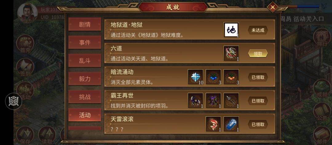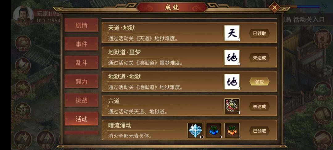 在“一只”大佬天道地狱道攻略的基础上,鉴于个人没有那么多V佬神器(二动、自定义、姜维解状态、甚至邓艾甲都换不到),摸索了几天,在有限资源的情况下总算完成六道成就,拿到了乾坤刀,地狱二周目有望! 主打拿成就,只要在一个存档内连续通关地狱道、天道简单模式就行了。 【资源】 兵仙刘备(这个万能皮非常好用,强烈推荐) 神浮生(没有天罡皮也能过,就是对属性要求更高) 医仙孙乾+孙子兵法2-3本 每种果子3