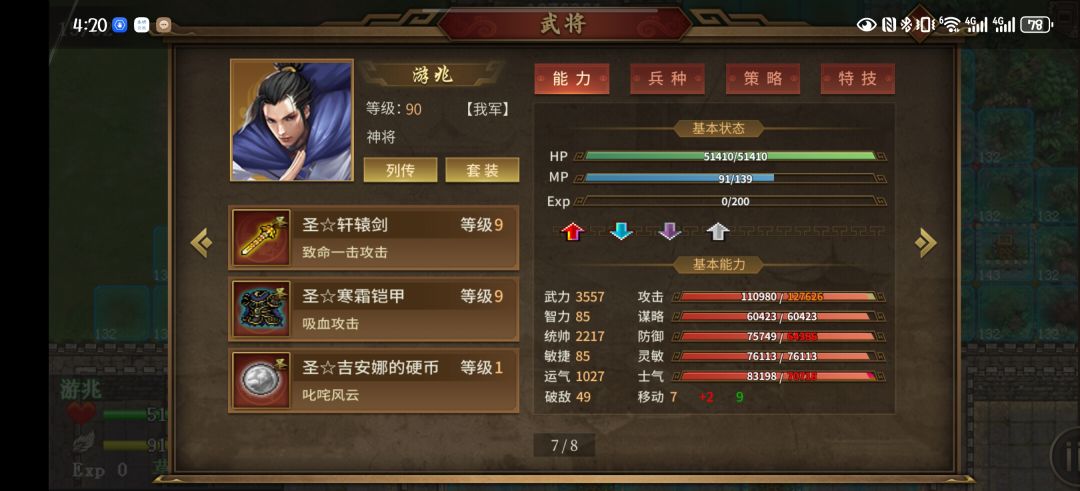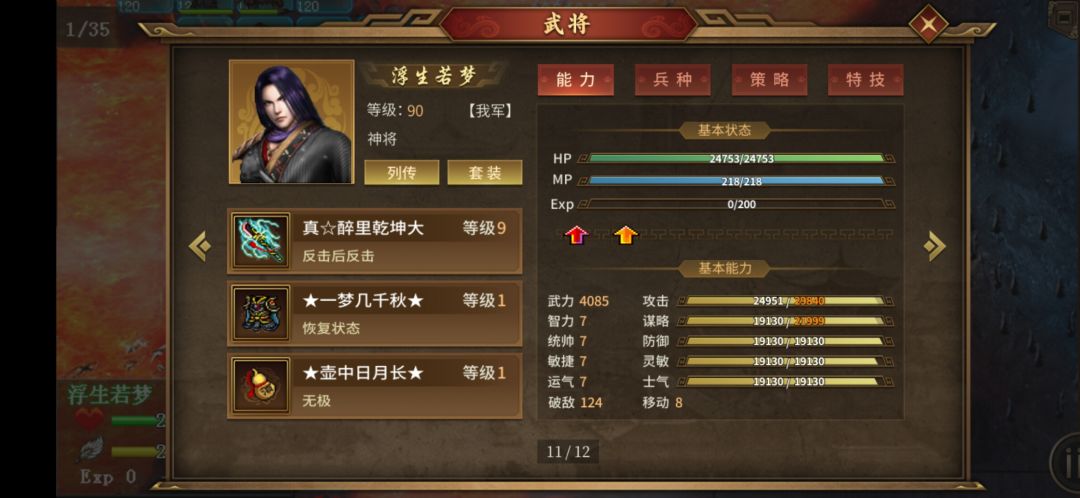 熬战两天终于拿下了神印,没有刘备皇天,就拿饕餮甲保人,没有兵仙破不屈就拿4本孙子批不屈的,特别是白门楼没有法必和破不屈的只能一直sl,蜀国13神将到的时候只能疯狂卡位和分散位置,就白门楼就打了5小时,好多都是最后一回合结束的,全靠天罡浮生带个锐,刘备指望不上面板就5000防都破不了,幸好看了大佬打赛亚人那个攻略,不然最难的那两关赛亚人根本打不了,写一下我的心得:上面有我的面板属性。 首先浮生要有属