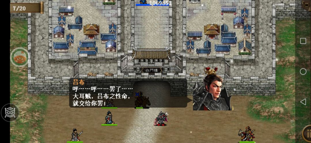 二周目地狱白门楼白嫖党打死神吕布浅析 先说配置: 刘备皇天二阶套(爬塔白嫖的)和陈到灰影,孙乾医仙,糜竺孙子(这两个是保证状态和容错),是的你没看错我过关就是靠这些! 再说流程: 先让刘备往上走到城门口右侧(别进去,此举是避免把浮生引下来),吕布也只会走到城门通道四小兵的左上小兵的上面位置(吕布先移动,四小兵被刘备反击死,至此城门通道只剩吕布一人),下回合人全部稍微往左下移动,注意吕布的攻击范围,只让陈到吃伤害(避免奋战11斩),然后陈到贴身“保护”吕布,刘备输出(被吕布先手混乱sl),输出不够天佑(没霸气,我是走的功勋流,此前刘备还是一级),就是最后一下必须把吕布生命值清零(打出不屈),不然吕布低于多少生命值会复活 总结: 1.要一有伤害的主力 2.要有灰影限制吕布 PS:我的陈到死了(浮生天雷点名),位置是在图中吕布下面一格,还有交流群的兄弟提醒说可以穿玄武甲(很好的建议),此外我在tap看到有大佬发的地狱杀浮生和吕布的攻略视频,是要高级装备的,可能不太适合没太多积累的白嫖玩家(轻喷)。我是五群的狗头军师,欢迎大家来五群一起交流沟通! uid1069851