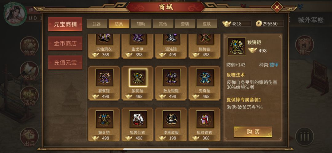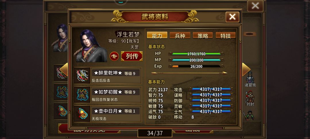 玩了一年多,微微氪,目前7周噩梦刷果。在攒元宝买锐,无聊中翻到一个4周通关后的存档,尝试了一下5周地狱,极度烧脑后总算过了。 说下资源: 1、皮肤:都是些必备的基本皮肤,皇天刘备、水君关羽、逆鳞赵云、禁卫陈到、医仙孙乾,其他没舍得买 2、角色:浮生(4周末有活动刚买的,属性5,还没留果子吃),吕布(6元送的),垃圾孙策、潘凤(买来压级用的) 3、万人:重要的万人斩都有,刘备、吕布、诸葛、马超必备,