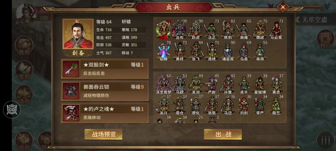 必备:(刘备轩辕)(吕布魔君)(辅助灰影)(陈到禁卫)(武器霸王枪) 刷的时候注意存档 左路陈到第一回合出门一格(好处是如果被雷劈到就退一格,有俩次容错,多存档有好处)其余往后撤,(到后面等级起来了陈到会反击打死小兵,所以可以用诸葛+简雍+法正混乱鼠目士兵到张角出来就得控制小兵血量让张角去奶,注意张角的天眼范围 站位和装备就如视频第一张图(貂蝉可以换一个精神高不被小兵俩下打死的就行)(下路看情况刷