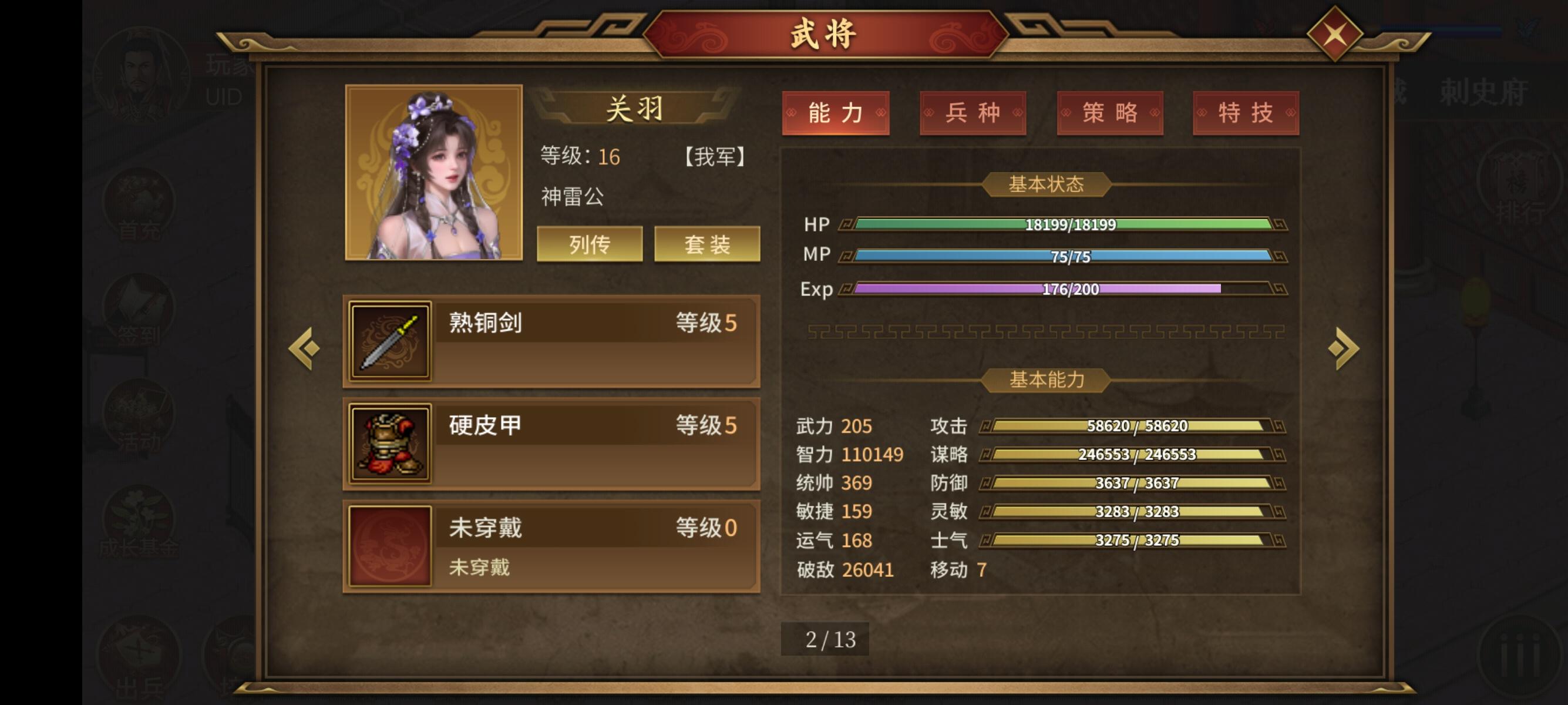 上面是主要培养三个人物,神司马有炸+锐+法必,天罡有无视距离反+物必+锐+镇卫、万人刘备、雷公(未展示有秘典敏攻40%)。目前历史噩梦8,幻想噩梦1。演武3001,大乱斗800#同人圣三国蜀汉传 汉