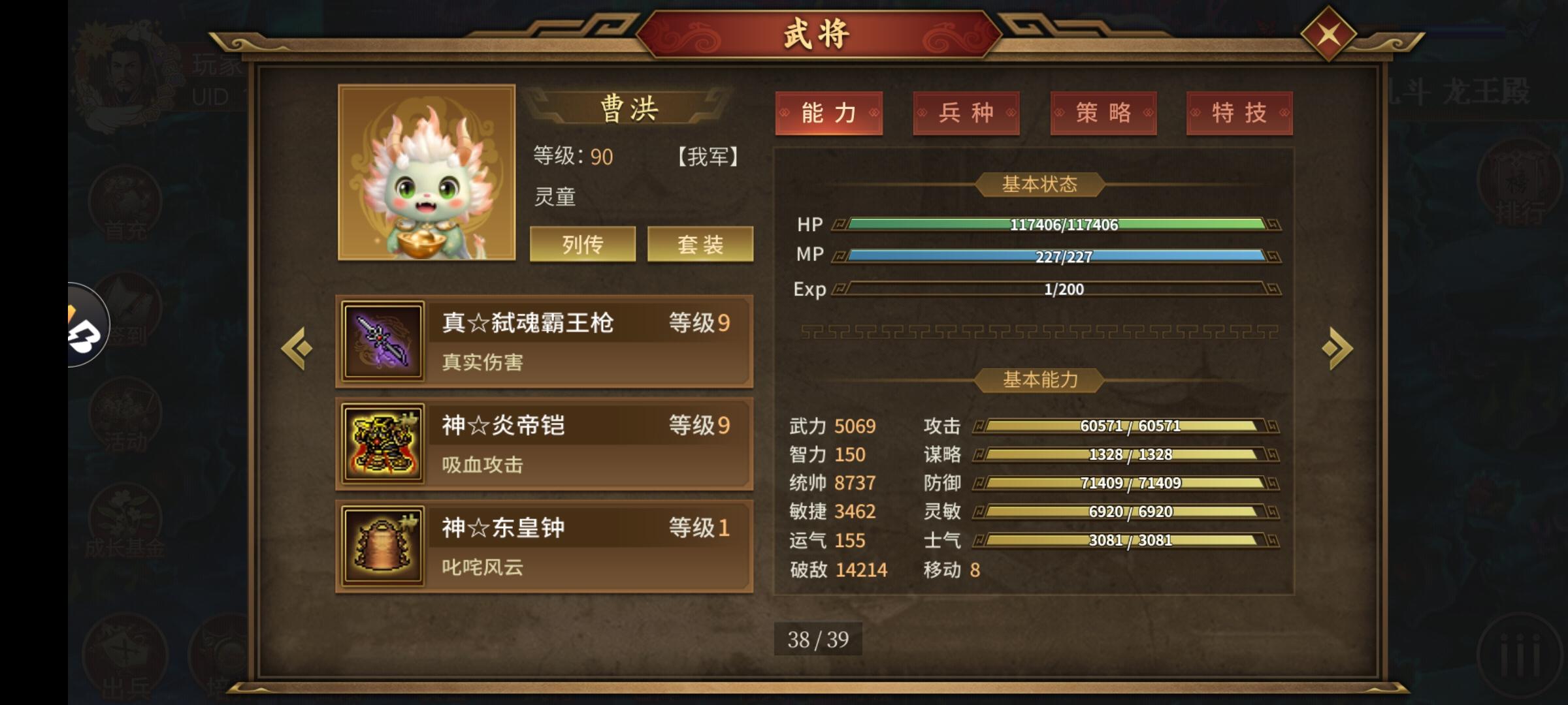 上面是主要培养三个人物,神司马有炸+锐+法必,天罡有无视距离反+物必+锐+镇卫、万人刘备、雷公(未展示有秘典敏攻40%)。目前历史噩梦8,幻想噩梦1。演武3001,大乱斗800#同人圣三国蜀汉传 汉