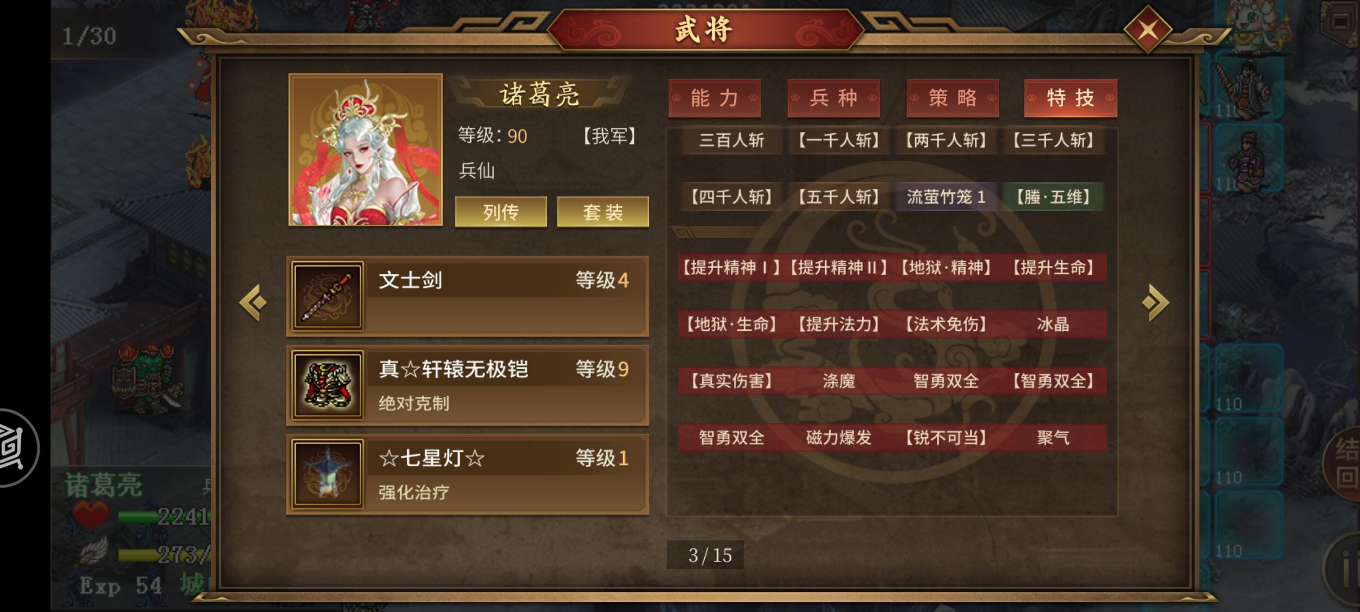 培养诸葛亮和司马懿诸葛亮套的是仙女皮,所以攻智一体,所以吃攻击果,给他加攻的装备,加攻的特技。诸葛亮我堆了很多羁绊,爬塔1万5层,再给他弄个黄月英神将,这样触发珠联璧合羁绊,司马懿的话,是智力果加智的装备和特技。在爬塔,1万2000多层进图就能秒敌人,一般的话都是1分钟以内一张图,强制关的话,除99关能够引导炸秒蚩尤,但需要15回合所以一般6分钟内通关,其他再难的强制关的话,也不会超过两分钟通关。