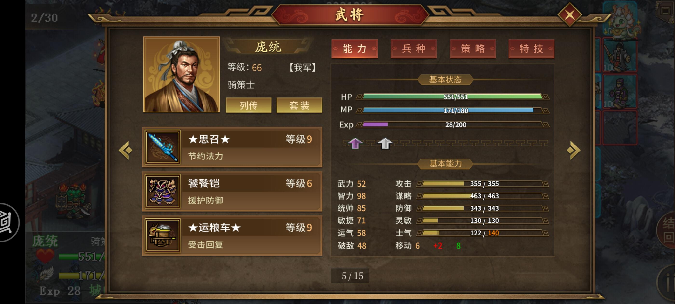 分享一下挑战关低配置,两千多智力就能过。主力:万人轩辕刘备,兵仙万人诸葛,貂蝉辅助。加上保人装备等,兵仙打折6666元宝,总共大约需要10000元宝。特技都是活动关送的,二百层给的锐不可当,没有破不屈的武将最后一关打的浮生府,分享一下心得和站位。 放弃下路,就只有上路八人出站,由于诸葛旋风需要四五次才能打死王路飞,需要带四个孙子兵法刚好能打死。 打的过程中发现,敌方谋略大于我方谋略,依靠
