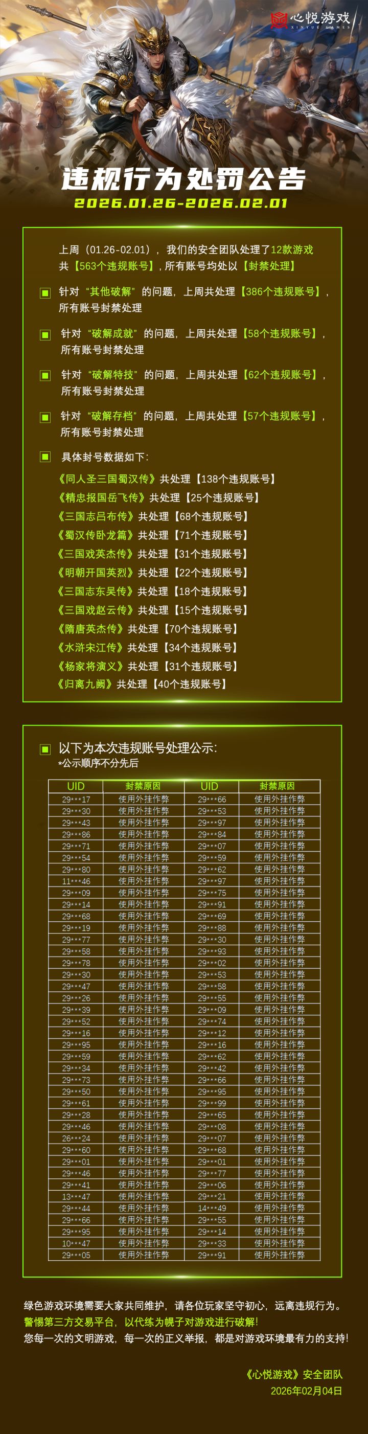 心悦各游戏违规行为处罚公告