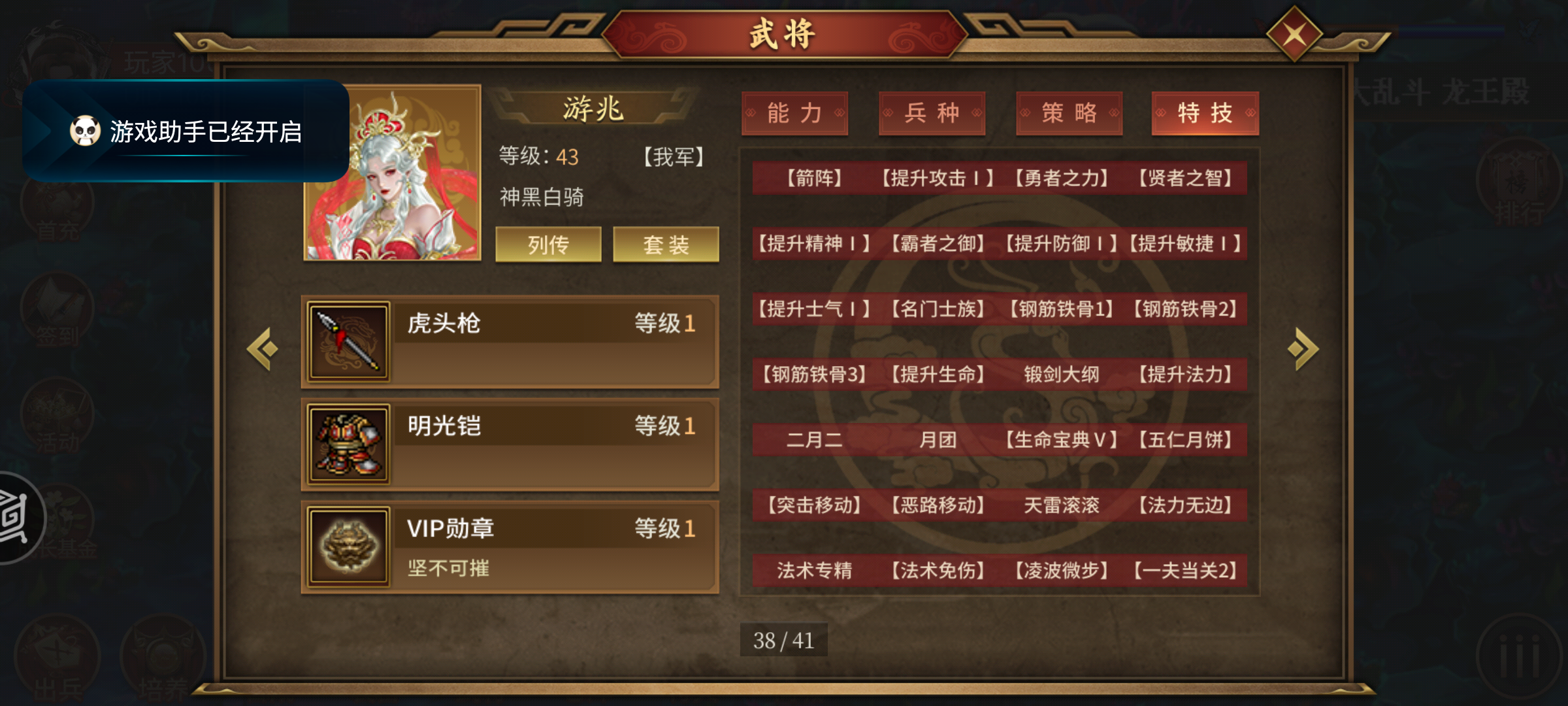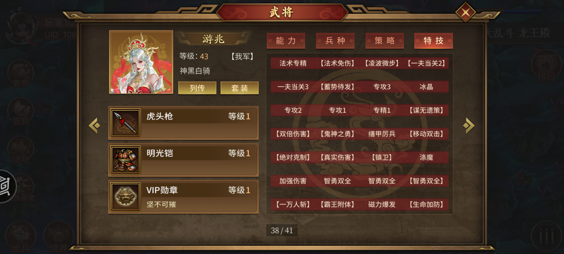 个人特技:众志成城7%万人斩:唯我独尊秘典:强化连斩40%强化众志5%绝技:桃园结义(全军生命恢复25%)攻守自如35%专属特技:众擎易举(扩大众志为4格没羽)衣带诏/血衣带诏(地形130移动+2复活)神技:颠沛流离(穿越移动,移动加攻击精神15%)专属皮/信物:宝刀(生命真伤20%)激励(5格众志7%)命途多舛(生命提升50%)百折不挠(防御转全能30%)羁