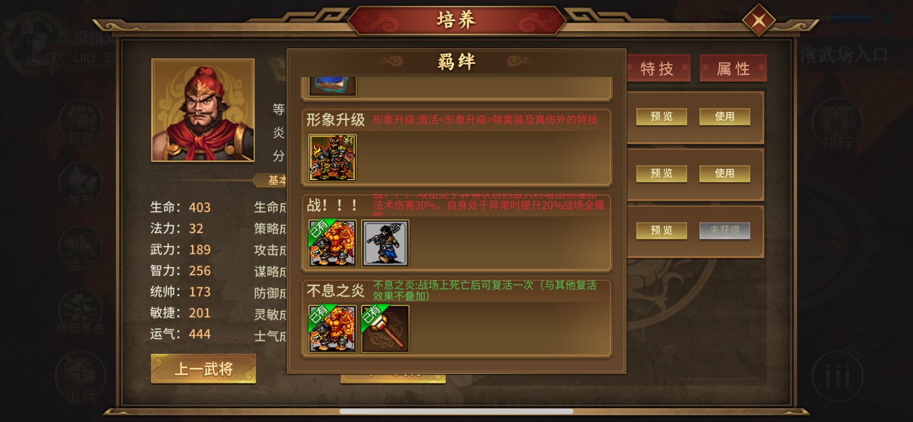上面是主要培养三个人物,神司马有炸+锐+法必,天罡有无视距离反+物必+锐+镇卫、万人刘备、雷公(未展示有秘典敏攻40%)。目前历史噩梦8,幻想噩梦1。演武3001,大乱斗800#同人圣三国蜀汉传 汉