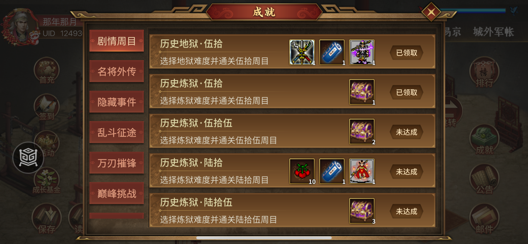 10月1日读档1周目存档,转砍幻想线,肝2个月,双线地狱毕业,一个字:爽!萌新最快拿齐幻想线、历史线双线地狱成就最佳推周顺序:幻想线开局,1普通、2-5困难、6-10噩梦、11-50地狱,难度逐渐加,能拿齐成就ok萌新砍通地狱最省资源培养:1.只养4人及购买皮肤浮生(破军),攻果刘备(皮肤可无),防果关羽(皮肤可无),智果赵云(雷公),敏果、士果2.主砍浮生1人,其余3人单人关(
