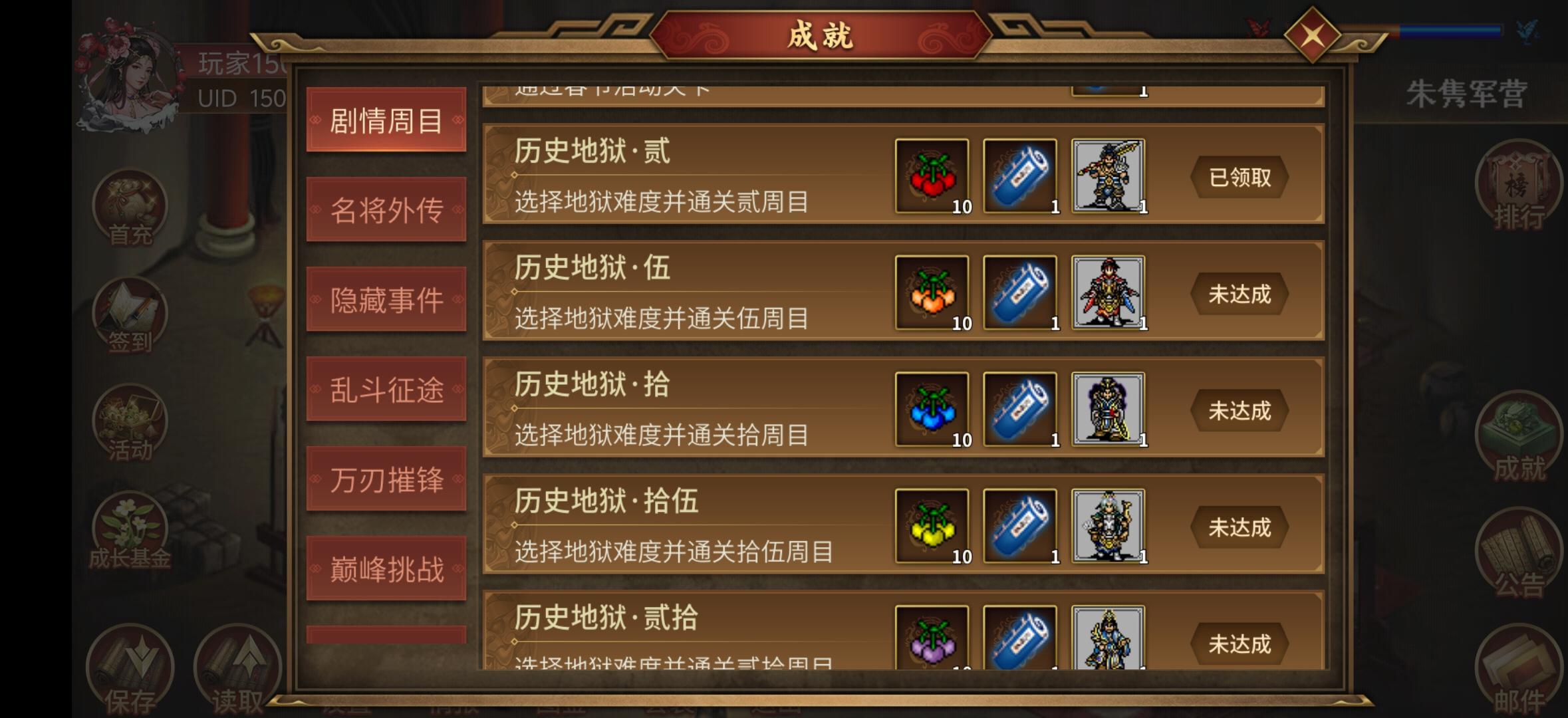 10月1日读档1周目存档,转砍幻想线,肝2个月,双线地狱毕业,一个字:爽!萌新最快拿齐幻想线、历史线双线地狱成就最佳推周顺序:幻想线开局,1普通、2-5困难、6-10噩梦、11-50地狱,难度逐渐加,能拿齐成就ok萌新砍通地狱最省资源培养:1.只养4人及购买皮肤浮生(破军),攻果刘备(皮肤可无),防果关羽(皮肤可无),智果赵云(雷公),敏果、士果2.主砍浮生1人,其余3人单人关(