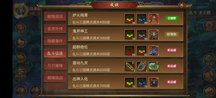 2个月太枯燥,单破军砍到1万层,8千~1万层敌组合刷出不再随机性,一直固定为甘宁组合,压到19级砍(见图片1万层甘宁属性),没难度。1万~1万5千层,无敌军,进图1回合自动结束,狂刷功勋、练果。我是全员层层练果,推周4主力(浮生、刘备、赵云、关羽)属性均已养成,见图片。浮生套装也可附魔了,攻击提升大,赞!演武奖励的大将军皮、神套装、神印太诱人,对普通玩家来说,应是可轻松拿的最大福利,唯一要求: