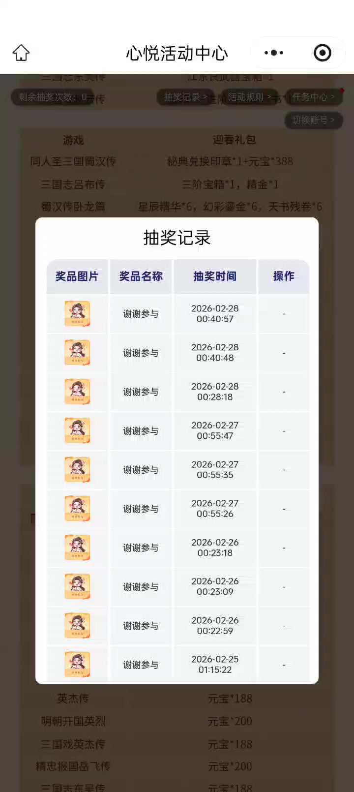 本来过年期间坚持打卡就不容易,今天活动结束领完奖励,看着空空如也的邮箱,实在有点绷不住了。 简单算笔账:这28天,我一天没落,每天上线做日常、点签到,就为了凑这91次抽奖机会。 结果呢?连个像样的稀有道具都没见过,稍微有的还是满减卷? 说实话,我不是不能接受“运气不好”,毕竟抽奖看脸。但我接受不了的是:我付出了全勤的时间成本,换来的却是“参与了个寂寞”。 如果是三两天的小活动,没中也就没中了。 但