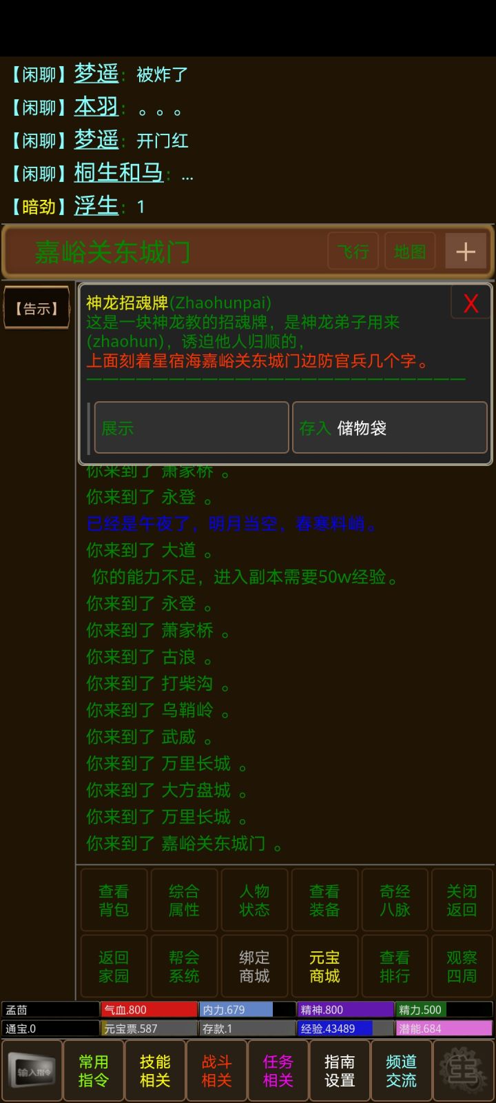 官方Q群:568699357侠影江湖欢迎来到侠影江湖,本服门派特色鲜明,武学平衡,巫师与玩家零距离沟通;是书剑类mud:与争锋、地狱等服务器不同,着重于解密,没有转世内容,但洗心可以带走门派武学,门派和武学也大不相同,还请阁下对江湖多些憧憬。基础属性介绍:先天属性同时也会影响解密,具体解密的属性要求请移驾「指南设置」-「我的解谜」臂力:影响伤害、命中与负重上限,十级基本空手武学加一点后天