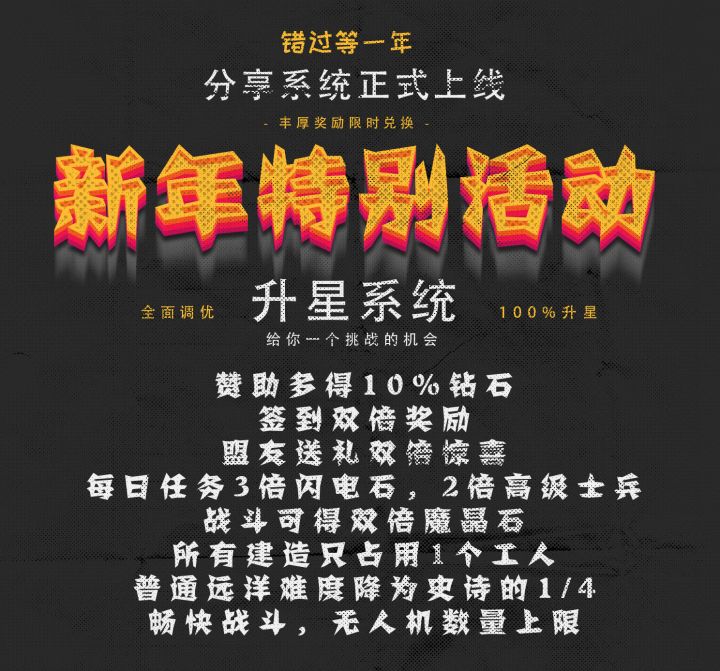 溪谷新年活动盛大开启,升星系统全面开放,分享系统全面开放!力度空前惊喜不断!错过等一年!伟大的领袖,快来与军团携手作战,见证帝国崛起!