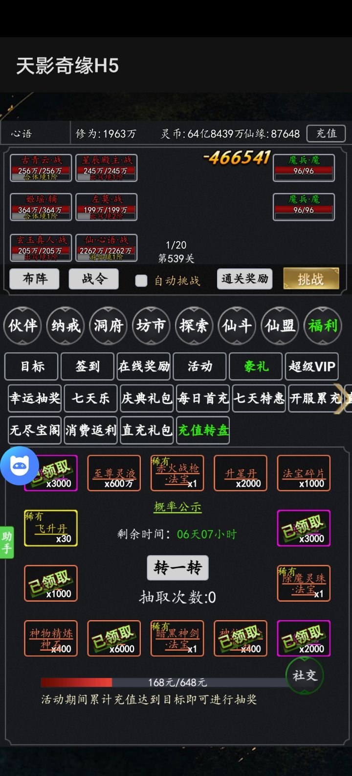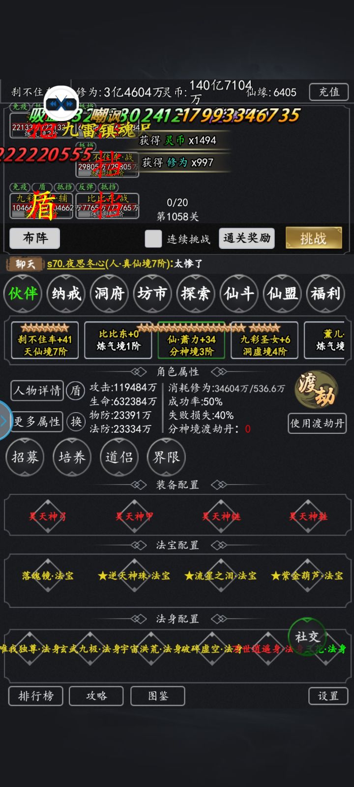 接下来讲基础洞府,有了活动的灵液,主角快速升红,功法买最低级的升阶,灵根灵阵13级就够用了,主升战阵和碗,这些没啥可说的,观星阁主点加主和战的,灵阵主点暴击,其他平均加。