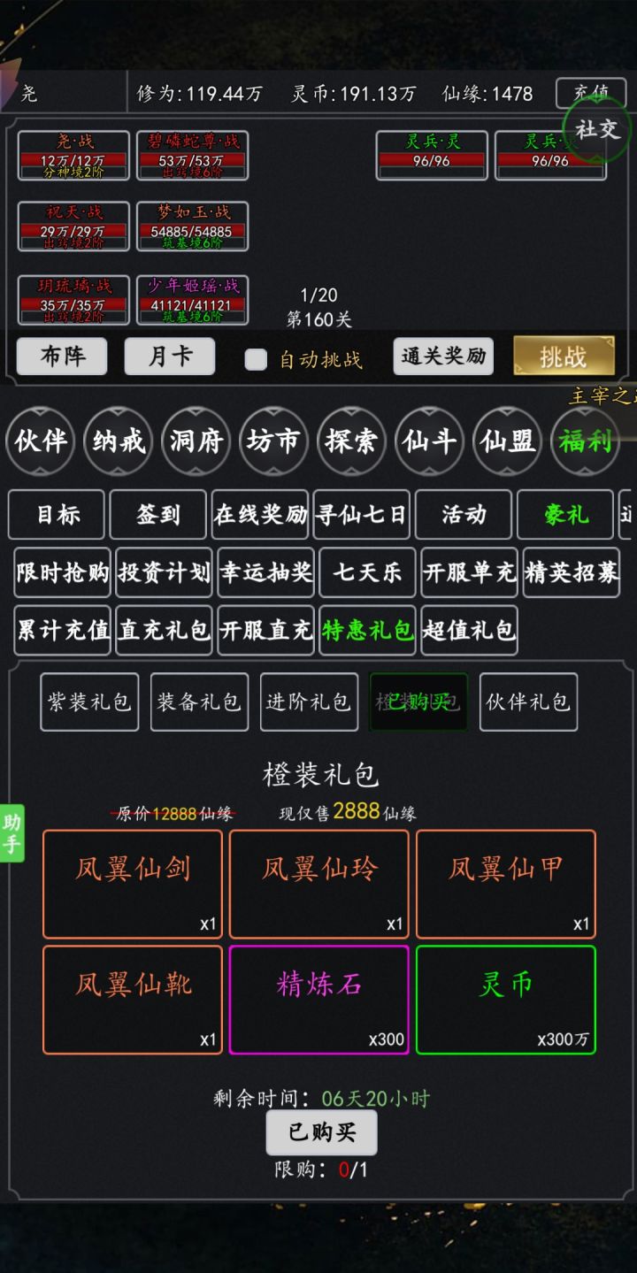 仙灵榜打满,每周结算仙缘和灵石,灵石加主的装备上。