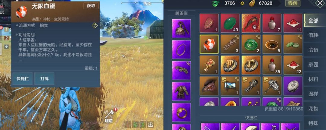 妄想山海之中,无限血蛋没有固定的刷新位置,在地图上随即出现,沙漠地带发现无限血蛋的几率较高一些。 无限血蛋是非常极品的道具,为金色品阶,可随即孵化出千年万年的巨兽,除了随即拾取获得之外,只能在拍卖行里进行购买。 有限血蛋与无限血蛋一样也是随机刷新的道具,为紫色品阶,可随即孵化出百年巨兽,除了拾取获得外,还可以通过交易和拍卖的方式获得。 总得来说,无限血蛋的获取概率还是相当低的,因此在拍卖行里的价值