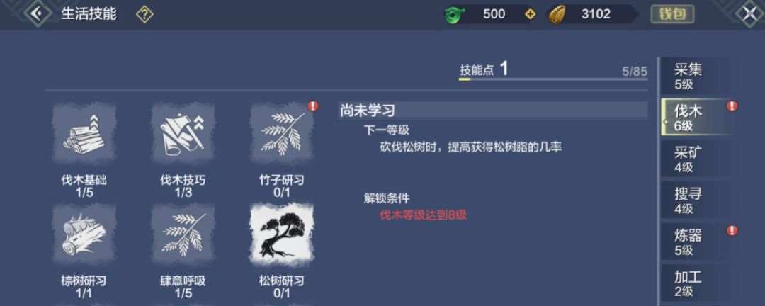 妄想山海可以通过使用日常的生活技能来提升生活技能的等级,从而获取技能点,技能点可以根据旅者的想法,进行自由分配。 游戏前期时,生活技能的技能点,主要是点在提高资源的获取效率这方面,而至于攻城类的技能、制造类的技能,则到游戏后期再点上就可以了;因为游戏后期需要用到更多的资源,因此前期要尽可能的存储更多的资源。 生活技能一共分为八个类型,其中包括了采集、伐木、采矿、搜寻、炼器、加工、种植和攻城。其中采