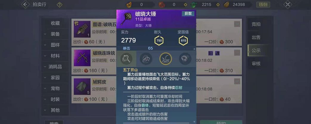 《妄想山海》中“大锤”比较推荐搭配“重光”、“五丁开山”、“闾阎扑地”等之类的技能,之所以推荐这三种技能主要是因为它们的技能伤害高、施法比较快、而且释放简单,非常适合“大锤”这样攻击性高但攻击速度较慢的武器,不过游戏中想要获得这三本技能书还是有点难度的,有兴趣的话可以去拍卖行看一看。 《妄想山海》中“武器技能书”的获得方法: 1、拍卖行:游戏中大部分的“武器技能书”都是可以通过拍卖行购买到的,如果