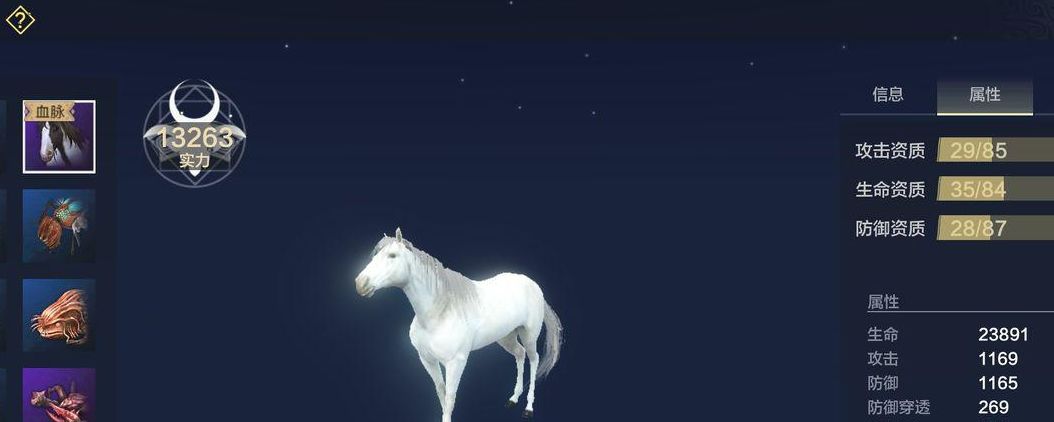 一、玄马 玄马是新手初期都带有的一个坐骑,从它的数值就可以看出,玄马的移动速度特别快为12.0,还有加速按键,是新手前期甚至中后期,都非常好用的一个坐骑。优点:移动速度很快,前中后期通用的一个地面移速宠。缺点:加速状态撞到东西会翻车,在水上移动速度过慢。不可以进行吞噬,因为没有攻击能力。二、闾麋这个是我们在游历时可以经常看到的一种食草性坐骑,原形应该是鹿,白色的皮毛,非常的亮眼,应该也是第1个能抓