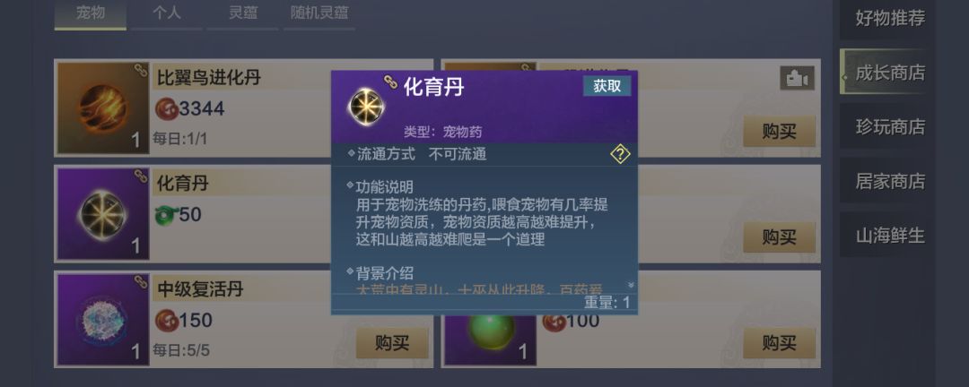 妄想山海中,化育丹是无法制作的,但可以在商城购买;也可以通过活动领取;或者在家园中送走访客也有几率获得。 一、商店购买: 1、点开画面右上角的小方块,选择“商店”; 2、选择“成长商店”—“宠物”; 3、在列表中找到化育丹,花费50脂玉就可以购入一颗。 二、活动领取: 在山海世界中,经常会举办各类活动或者任务,可以关注一下官方消息,看一下化育丹是否是近段时间的官方活动、任务奖励。 三、家园中送走访