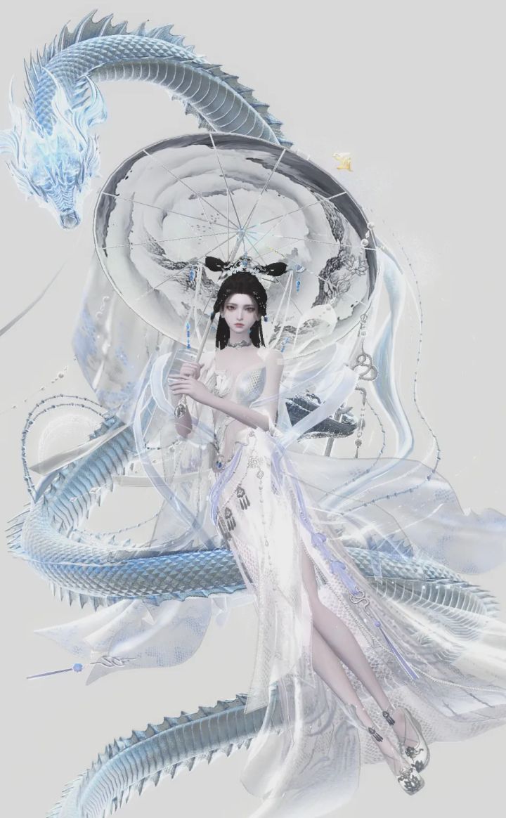 千年等一回~等一回啊~没错!山海中将再度上演那段家喻户晓的典故——白蛇传,本期的红品时装,一边是痴情等候许仙、不惜逆天而行的白素贞; 一边是手持金钵、不懂人间情爱的法海;这一次,你是站“痴情妖”,还是站“无情僧”?红品女装·素舞霜鳞“我的妻拥云鬓花容无改,真好似天仙女初下瑶台。”这套时装捕捉了白素贞“半人半妖,半仙半魔”的独特美感。 整体色调采用冰蓝与月白的渐变,衣裙特别采用了仿蛇鳞的刺绣