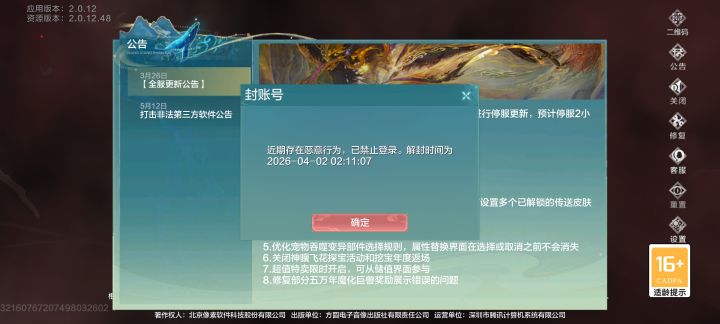 莫名其妙的封号 然后申诉两次 非得说我某方面违规 但是具体哪里违规 死活不说 还让我自己去回想 我回想什么 我回想前一天晚上肝到凌晨一点 第二天更新完进游戏拍个照就被封号了吗 这游戏没落真是活该的 但凡我是因为骂人被封我都无话可说 但这真是封的我莫名其妙