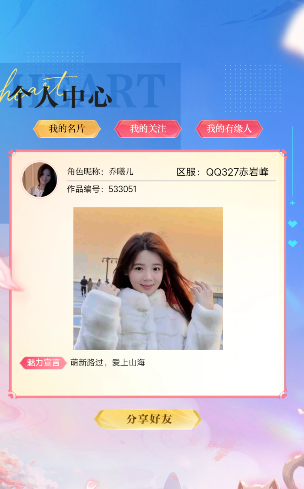 第一次玩这个游戏,也是第一次参加这样的活动!留在了山海,继续在山海中探秘!望大家给新人一个机会吧,投投票吧!