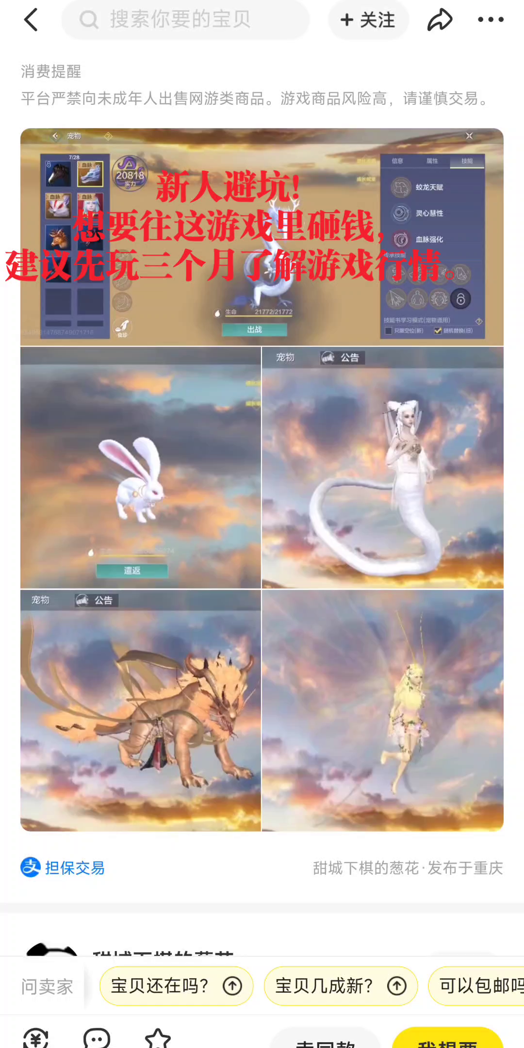 399一个蛟龙,这不抢嘛这是。 萌新避坑,一个蛟龙399这价格专坑新人不懂,另外这人主页还有399的三万年、五万年宠物定制和300(好像是)的服装,全是巨坑。服装看了一下他的动态已经有大冤种买了一个(300一个红色服装,游戏内你收勾买也就60、70左右),