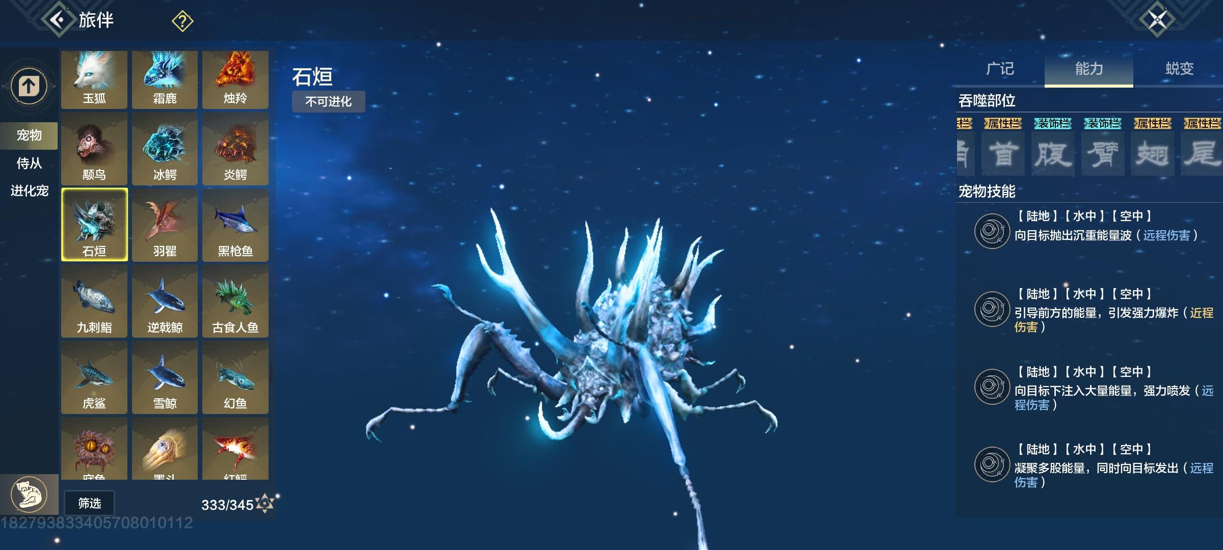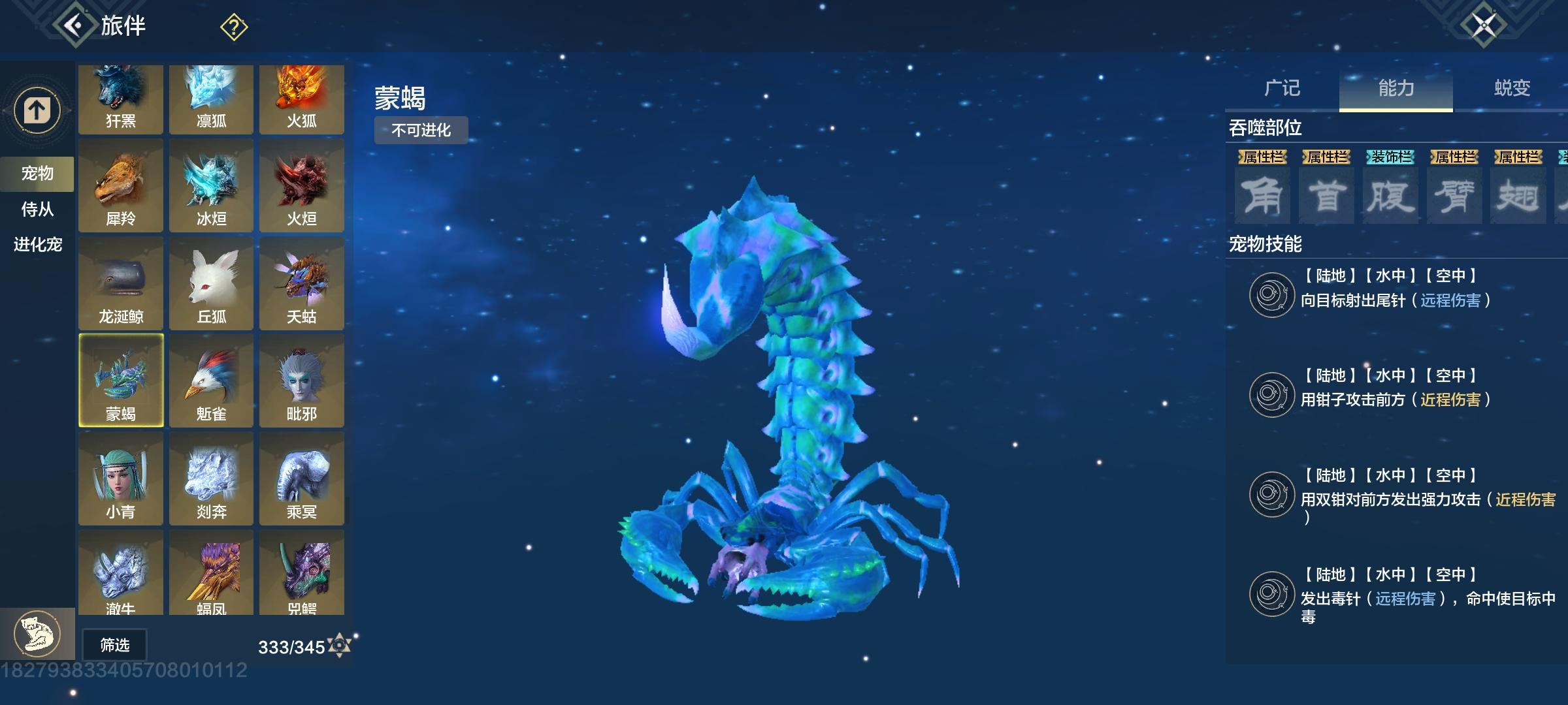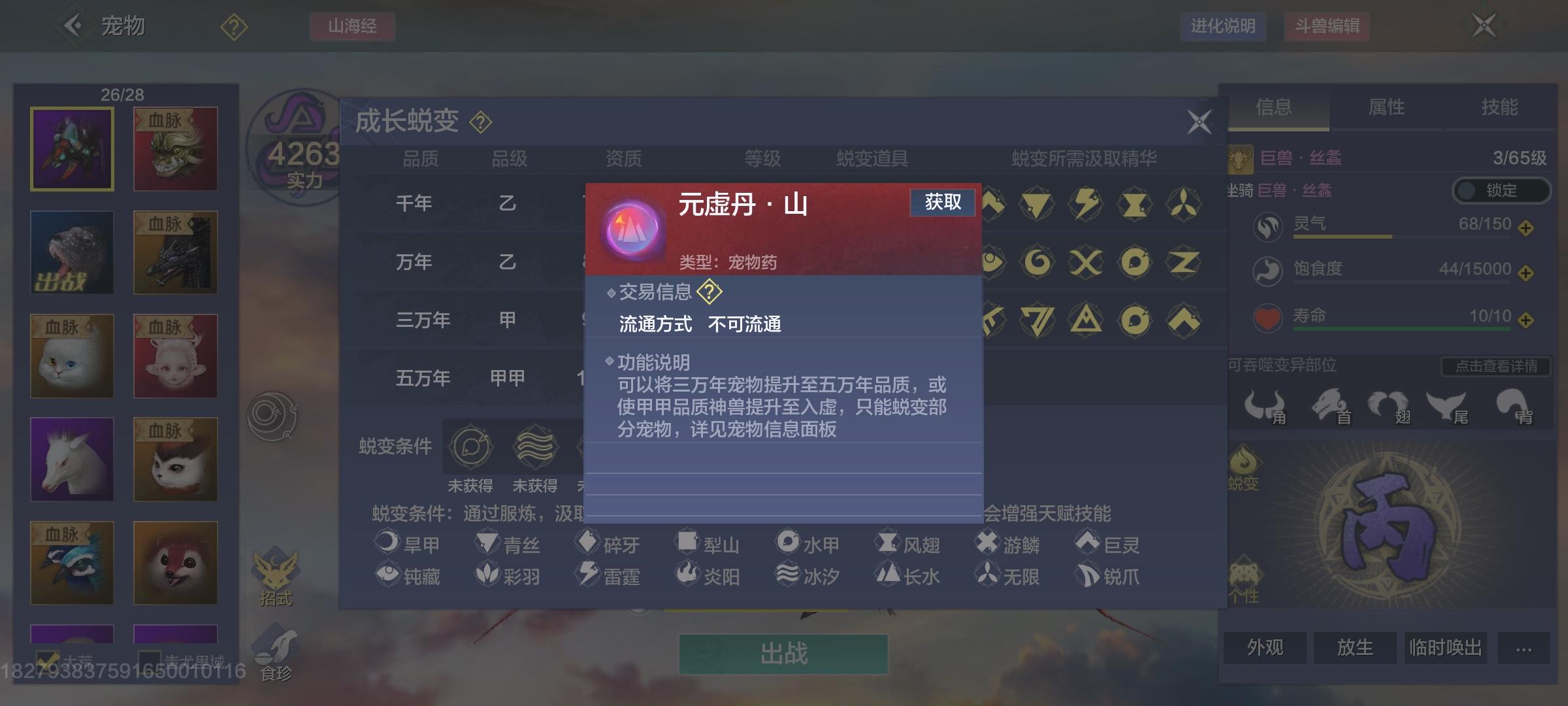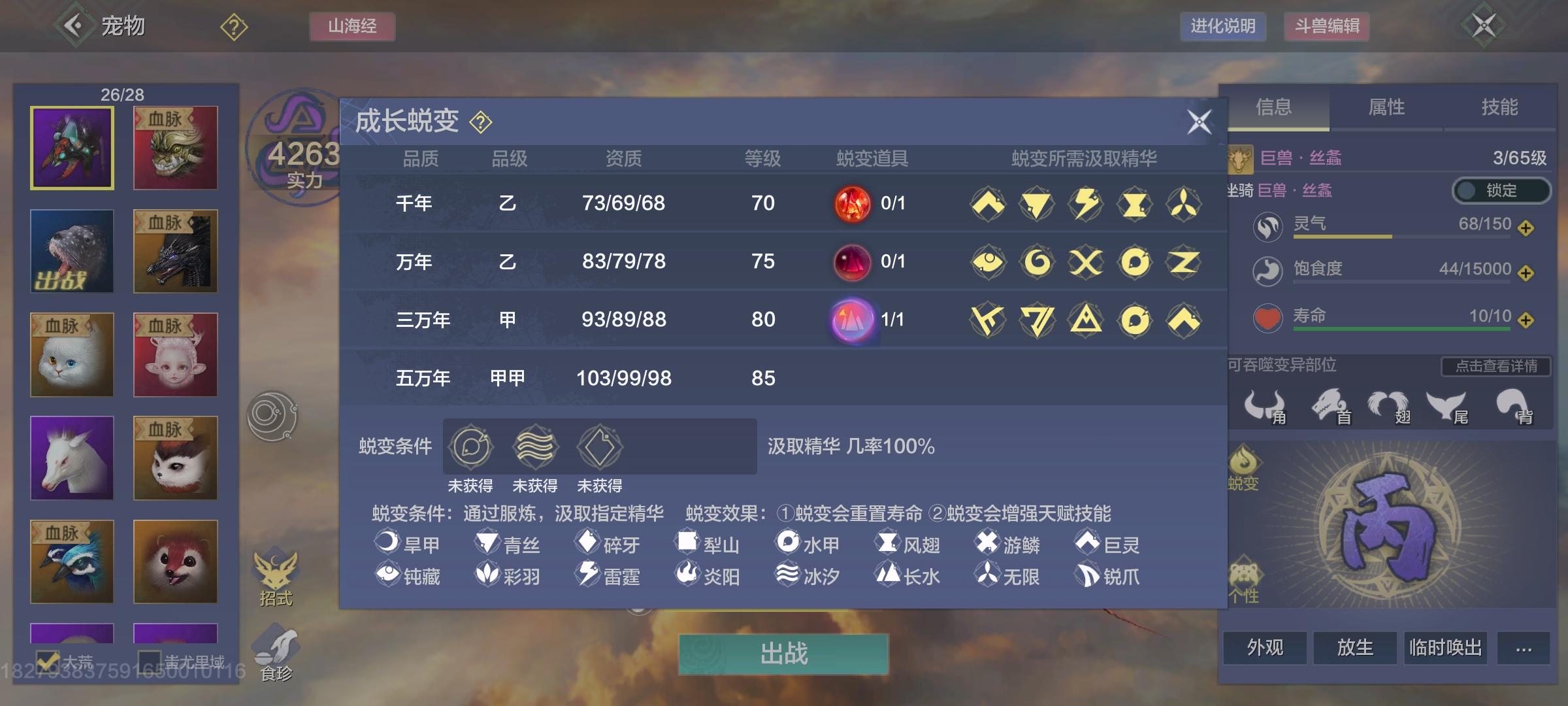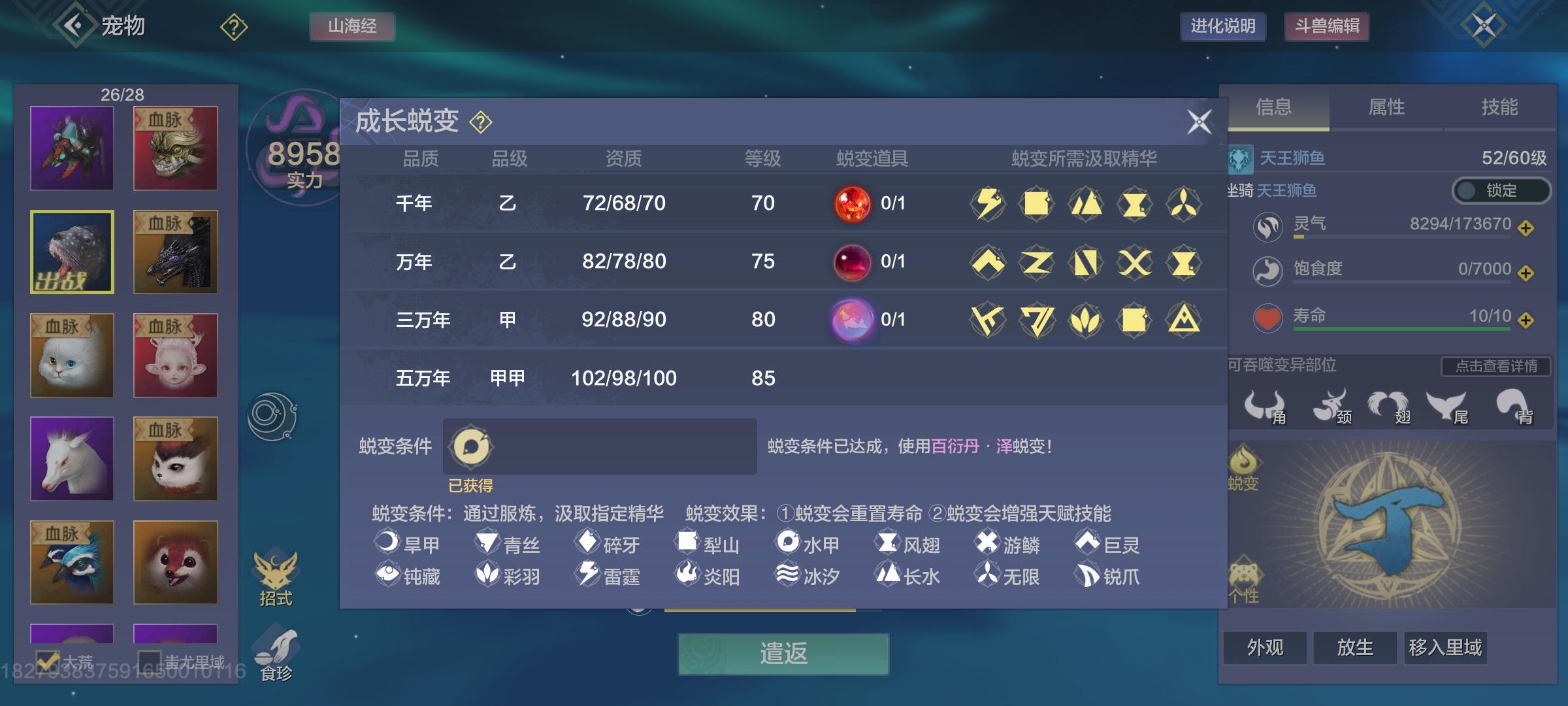 本来是准备给小小号弄个天王狮鱼当无限魂技宠物的,但发现这玩意是泽丹蜕变,到时候八万年蜕变泽丹太珍贵了,搞不了搞不了,变异部位还带个脖子(有脖子变异部位就天生比别的宠物元素攻击低),五万年攻击资质还只有102就在图鉴里找到了 八百年沙螽,这个蜕变是山丹,价格还行,五万年103攻击资质,6魂技孔(零天慧技能),变异部位没脖子(头角翅尾背)非常适合当无限魂技宠,百年元胎还好弄,求购就有还找到另外两个