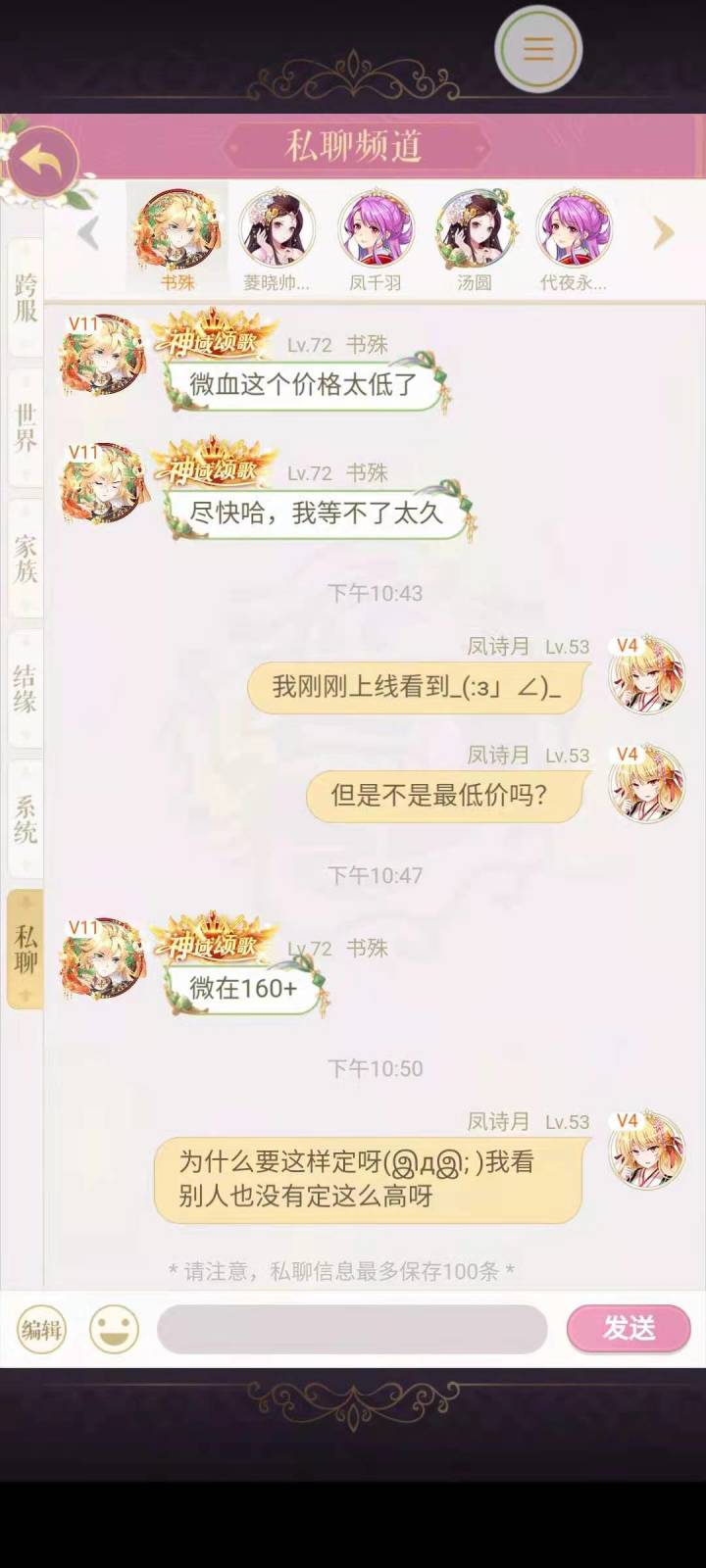 这游戏风气是挺差的,我也算老玩家,像蝶衣,酒神啊这些血统都有,虽然不是纯血是半血,现在退坑一年了,当时我家族排名第三,韶华第二(不知道还在不)。就因为他们有人卖的便宜,我们族长说了声败血,我们家族就被他们家一个充钱大佬针对,一直打我们。我当时是上网课,不知道情况,看他们在骂,问了一句发生了什么,就被他们追着骂biao子,白莲花,后来是我一个个私聊道歉和族长退家族才解决的,于是就退游了,还挺后悔充钱的现在
