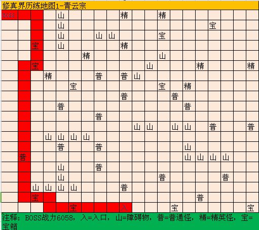 《修真界boss分布》一、修真界历练地图(1)青云宗,BOSS位置在地图左上角,地图共有普通怪物13个,精英怪物8个,宝箱10个。地图每走一步消耗1点食物,前期食物资源有限建议直取BOSS,快速通关减少食物消耗。主要产出:仙币、食物、木材、药草、精铁、灵石、1级强化石、2级强化石、筑基材料、筑基装备卷轴、重铸石、胎息绝学(凡品)二、修真界历练地图(2)昆仑山,BOSS位置在地图左上角,地图共有