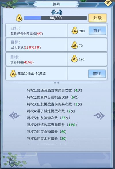 《尊号系统》1.尊号特权尊号是每一位仙友的门面,若是头上顶着个金灿灿的尊号,别提多有面子了;提升尊号还有以下好处:-增加普通资源购买次数-修真界挑战次数-仙友挑战购买次数-道子试炼挑战次数-仙友神游次数-修炼效率提升-购买食物、木材、药草、铁矿、银币增长那么这请问这么炫酷又实用的尊号哪可以买到呢?答案是不用买!只要每天保持活跃,完成每日任务就可以获得威望升级尊号!成就万