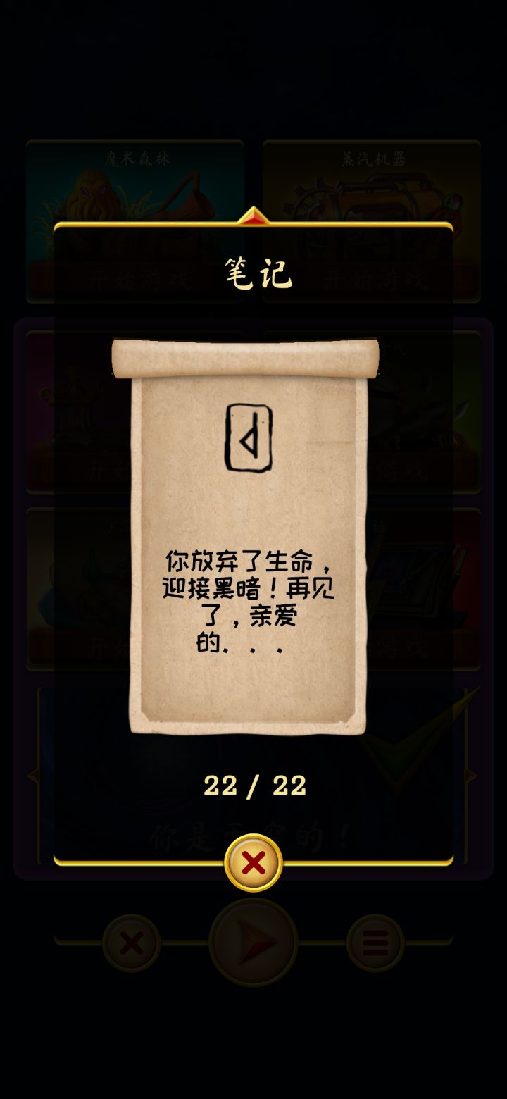 翻译有点烂,还有乱码,解谜难度尚可,有时候瞎点点就过了,把每个关卡的红蓝宝石收集全可以解锁额外两个关卡,得到的两个笔记对应两个结局,内容比较隐晦,大概意思是指失去的童年,我的理解就是……不忘初心牢记使命