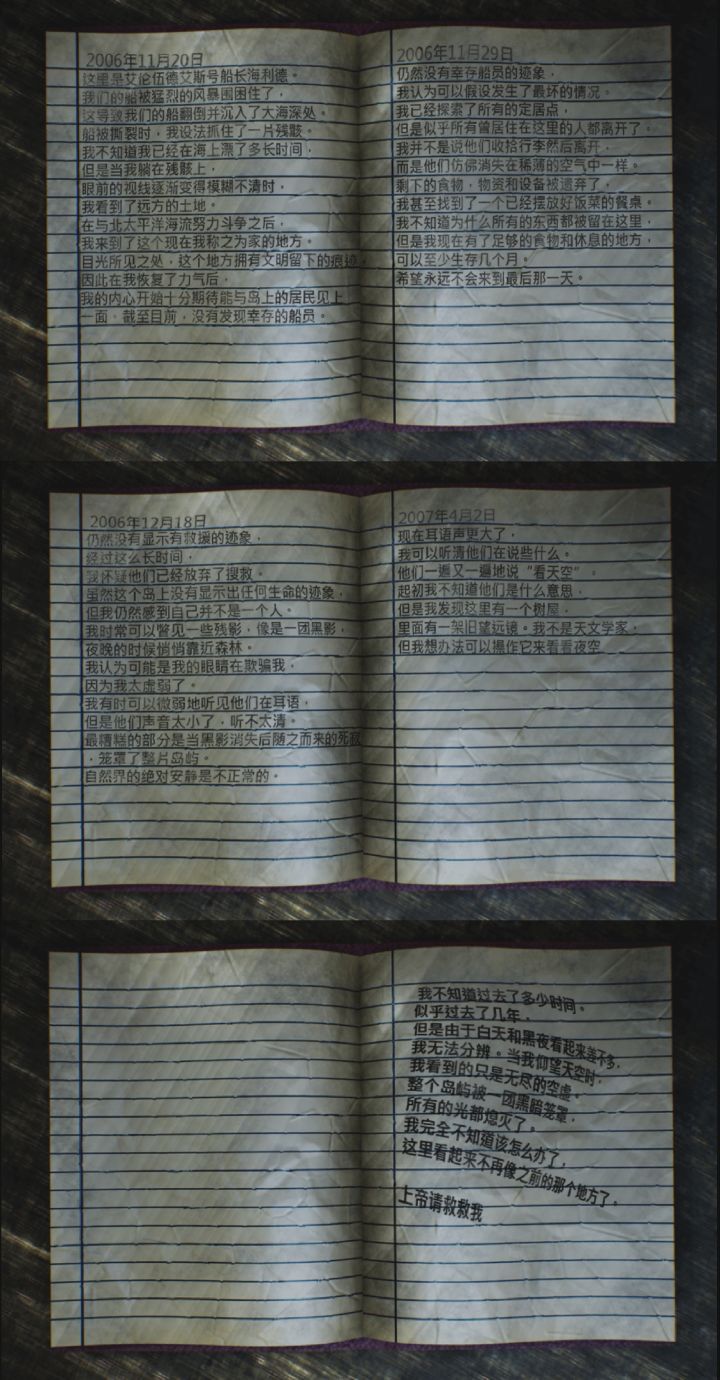 主角David Zander从桌上醒来,发现停电了。右侧的墙上获得照相机和背包出门发现保险丝盒坏了,并且位置太高够不着。后退左走去海滩,到船上获得车钥匙用车钥匙把车灯打开,照亮前面的小屋车内右侧的储物盒里获得螺丝刀。小屋里获得空桶和爬梯。用爬梯和螺丝刀修理保险丝盒,电力恢复供应。回到主角醒来的那间屋子,电脑上显示某地有异常状况,记住经纬度坐标。去船上的驾驶控制处输入坐标,不用带°