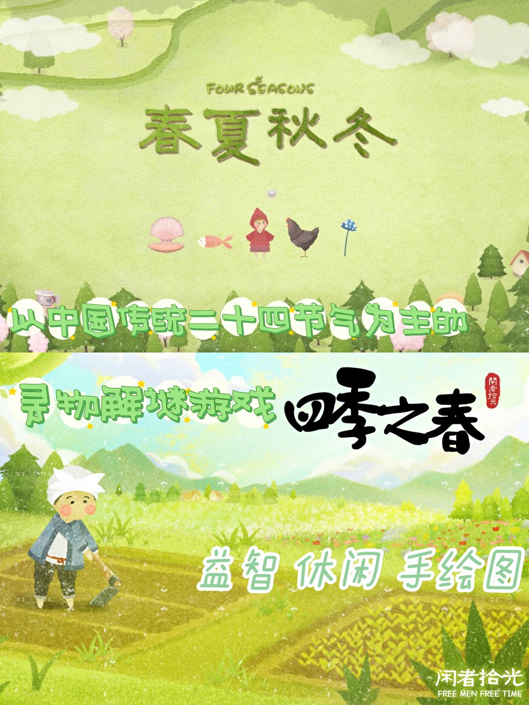 🐑游戏:《四季之春》 🐑支持:IOS/安卓/Steam 🐑类型:传统文化/手绘/解谜/益智/休闲 🧩游戏体验🧩 游戏采取章节剧情玩法,小清新的画风,带你感受春天的独特魅力🌱总共有六个章节剧情,每一个关卡都自动切换地图。关卡都是别出心裁的手绘图像,欣赏不一样的田园风光让你放松下来。十分惬意,真的好好看💗 🔎游戏介绍 《四季之春》是一款以中国传统二十四节气为内核的寻物解谜游戏,🔍游戏通过农谚将时令节气