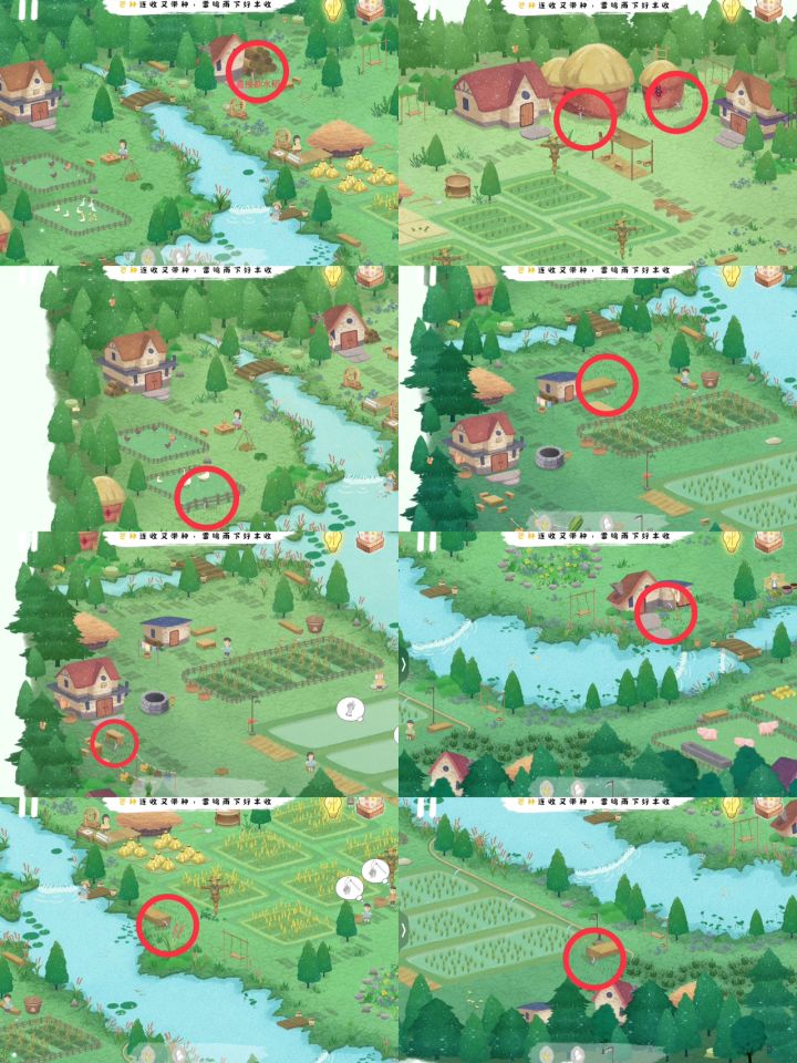 攻略贴,第一次做,我自己玩到哪儿,就一点点的写,后期会根据意见进行修改。请轻点喷,谢谢,😂前面的已经过关了,想试试攻略贴怎么做,所以从农夫钉耙开始春 季(一)立春1.找到钉耙(在蓝色小房子那里仔细看,我的已经捡过了,有可能位置会不一样),交给农夫。2.将找到的三袋花种洒在农夫开垦好的田地上,不要急,种子很好找,就在很显眼的位置。(二)雨水触发雨水奶奶的对话,天上会有四团乌云,如果我没